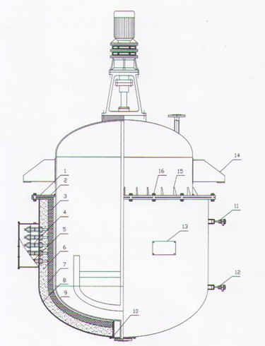 ![]() ![]() 1、固定法兰2、连接法兰3、远红外辐射加热区4、接线柱5、接线盒6、硅酸铝保温层7、绝缘云母板8、加热器金属外壳9、用户反应釜胆10、防爆密封件11、远红外上段测温探头12、远红外下段测温探头13、铭牌14、反应釜支耳15、三角形加强板16、法兰连接螺栓 |